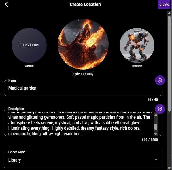 - Location → Cities, dungeons, or natural landmarks. Can also be generated in 3D.