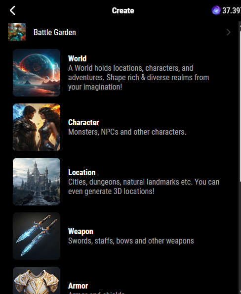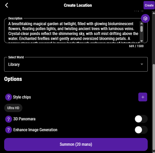Summons are the core of your adventure. They can be Worlds, Characters, Locations, Weapons, Armors, Items, or Spells. Each has its own Mana cost and unique options.