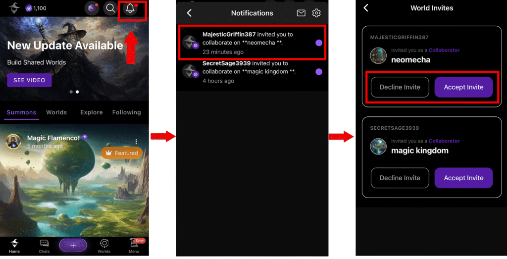 Tap Accept to join the world, or Decline to ignore the invitation.