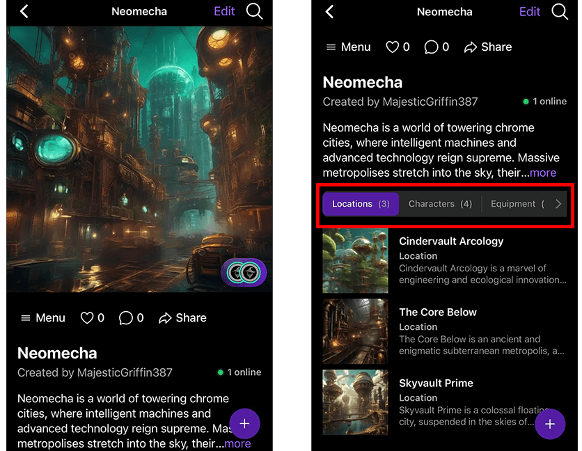 Once you accept the collaboration invite, you’ll be automatically redirected into the world you’ve joined as a member. Inside this shared creative space, you’ll be able to explore all the Summons bound to that world, including Locations, Characters, Avatars, Equipment, Items, and Spells created by the world’s owner.