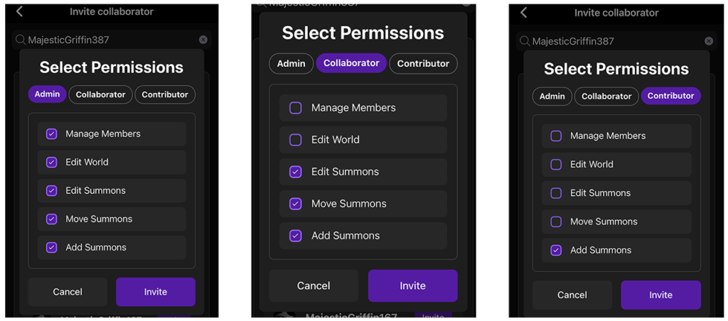 💡 Note: These roles are assigned when sending an invite and can be customized by checking/unchecking specific permissions like “Edit World” or “Manage Members.”